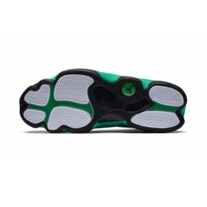 The Air Jordan 13 Retro ‘Lucky Green’ makes use of a familiar design that calls to mind Ray Allen’s coveted Air ‘Three-Point Record’ PE from 2011. The upper combines white tumbled leather with green synthetic suede, supported underfoot by the silhouette’s signature panther paw outsole in black rubber. Branding hits include a green embroidered Jumpman atop the tongue, matching the circular hologram on the lateral ankle.
