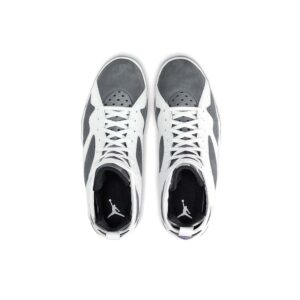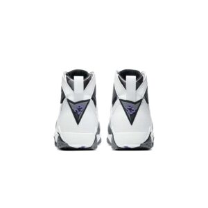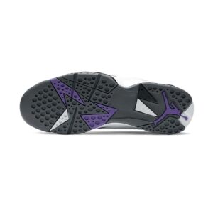 The 2021 reissue of the Air Jordan 7 Retro ‘Flint’ brings back a mostly neutral colorway that originally released in 2006. The mid-top silhouette features a dark grey suede upper with tumbled white leather overlays throughout. Contrasting purple accents make their way to the branding elements, which include a Jumpman logo on the lateral collar and ’23’ embossed on the geometric heel patch. Sharp angles reoccur on the seamless tongue and polyurethane midsole, enhanced with encapsulated Nike Air cushioning under the heel.