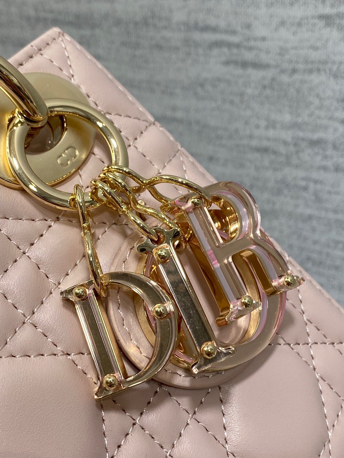 – D.I.O.R. charms embellished in transparent tonal resin