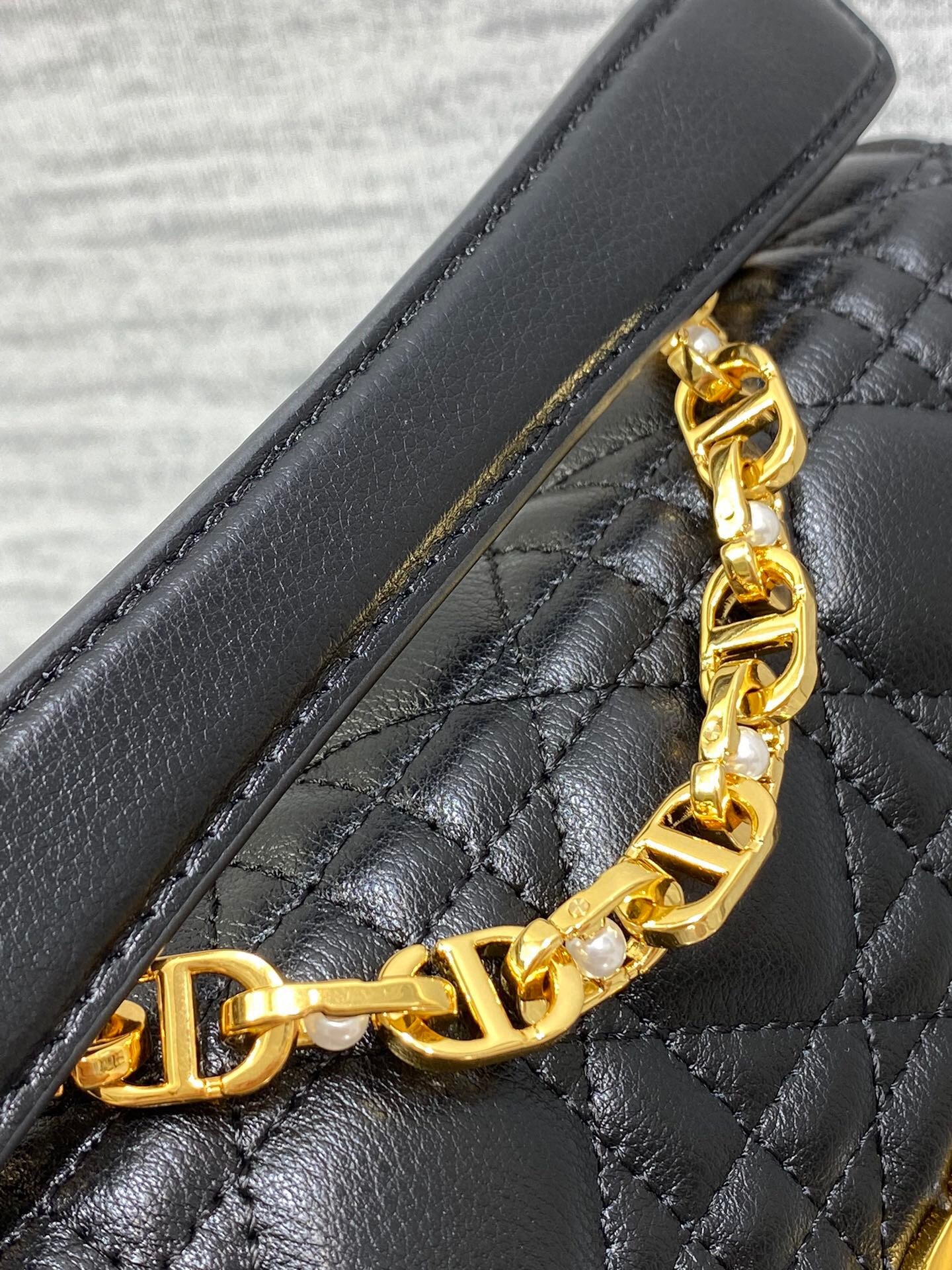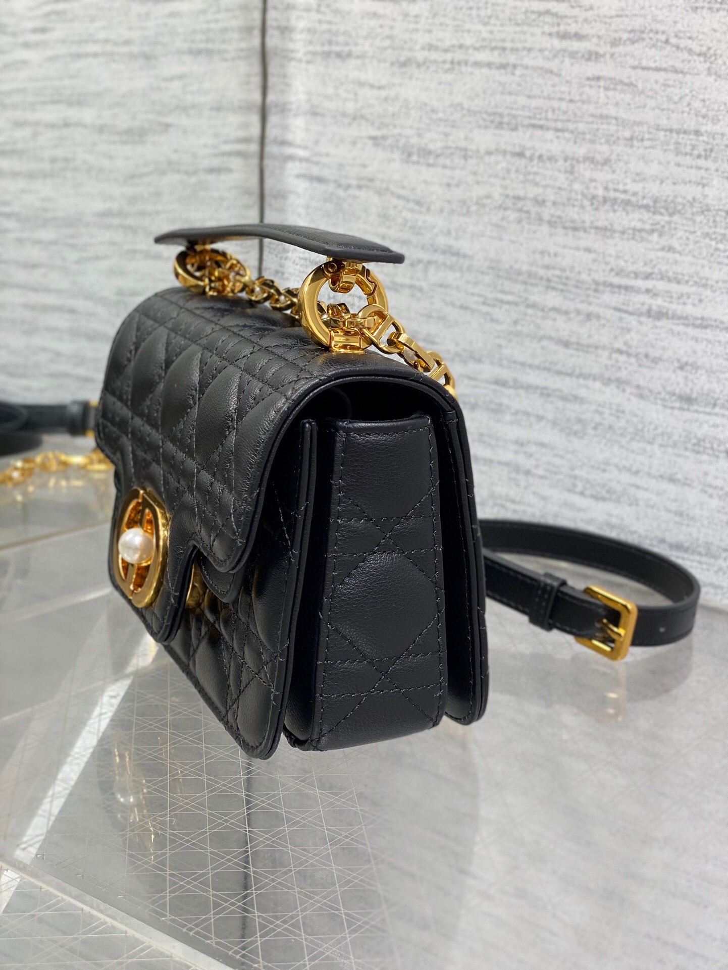 – Removable and adjustable chain shoulder strap with white resin pearls and leather insert