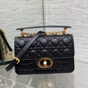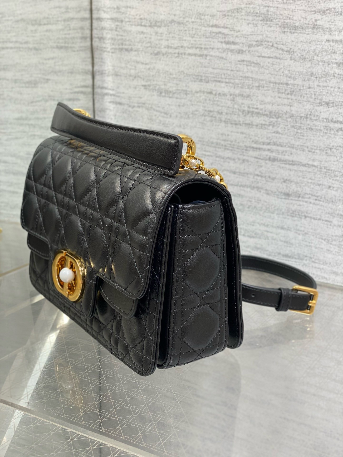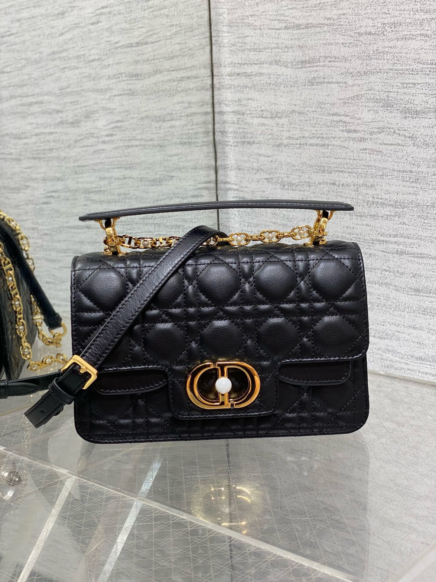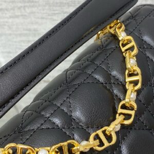 – Removable and adjustable chain shoulder strap with white resin pearls and leather insert