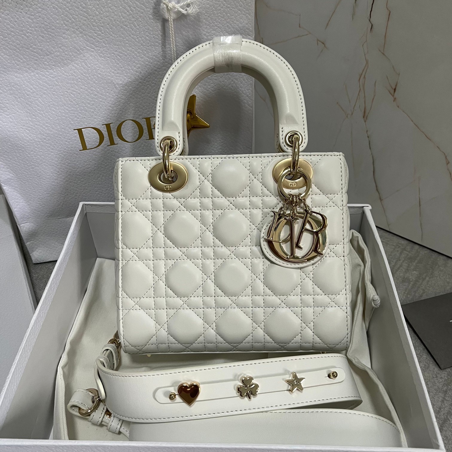 – Pale gold-finish metal ‘D.I.O.R.’ charms