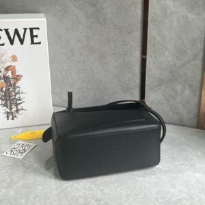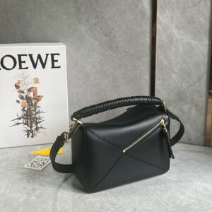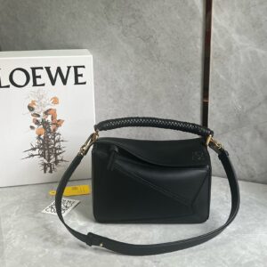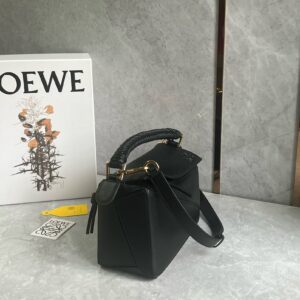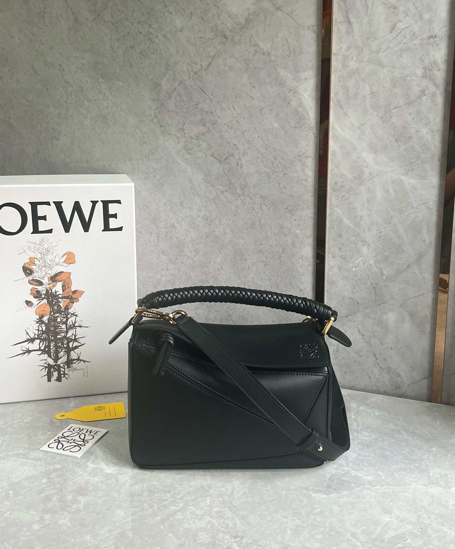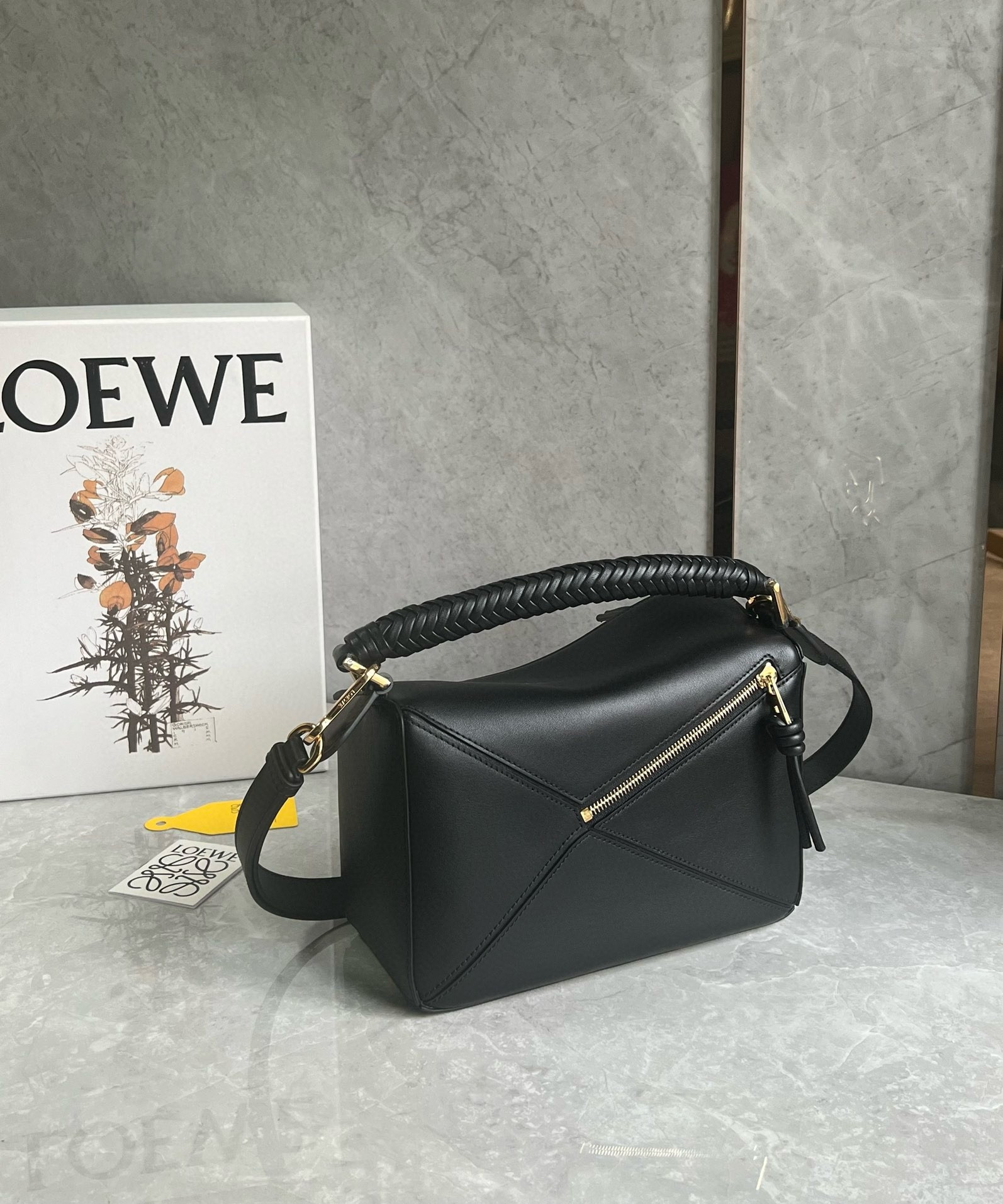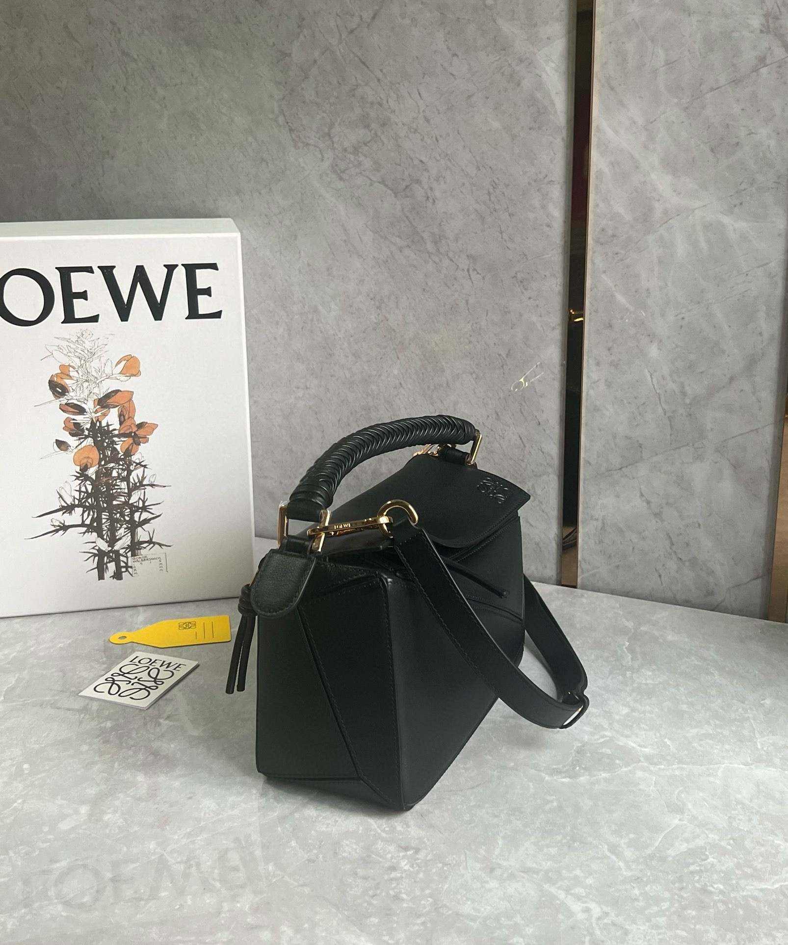 Loewe Puzzle Small Bag in Black Calfskin with Woven Handle