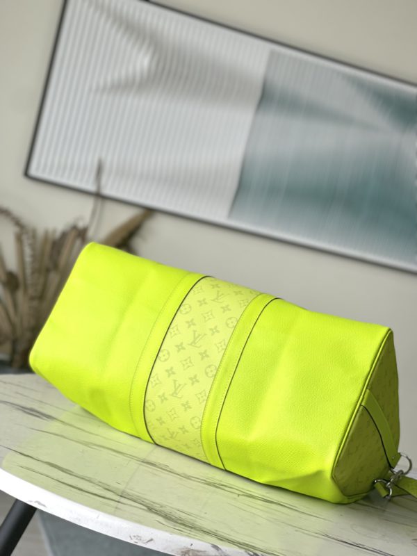 This Keepall 50 Bandoulière travel bag comes from the Taïgarama travel leather goods series, incorporating a Monogram canvas structure on the front and sides of the Taïga calfskin body. Check-in luggage size with detachable and adjustable shoulder straps, zipped inner pocket, and leather nameplate complete the overall design.