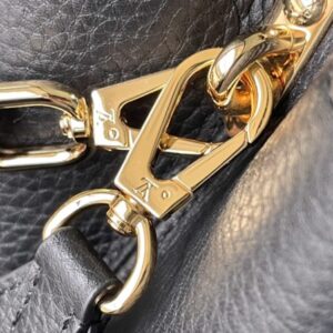 Black small This Capucines small handbag is made of Taurillon leather, the metal and resin links are interlocked with each other, and the top handle and detachable wide shoulder strap add a fun carrying method. The signature flap of the Capucines collection is folded in to reveal the logo.