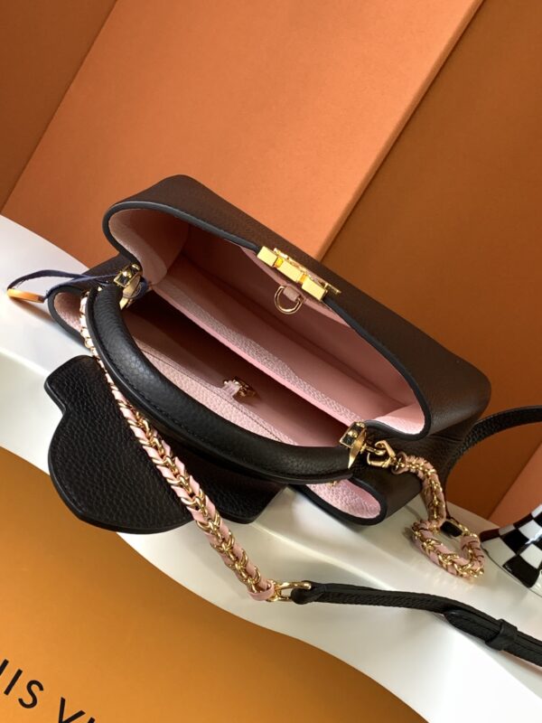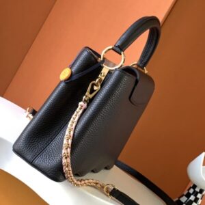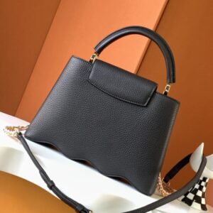 The Caushell medium handbag renews the Caushell design with a wavy bottom. The Taurillon leather is heated using a thermoforming process. After molding, shaping and cooling, it achieves a flexible shape like a shell. Detailed features 27 x 18 x 9 cm