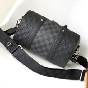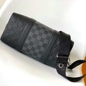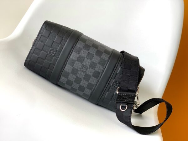 This City Keepall handbag combines Damier Infini embossed leather and Damier Graphite canvas to present the concise lines of the checkerboard pattern. The Damier motif is embellished with wide jacquard shoulder straps, richly detailed diagonally to the Louis Vuitton Paris signature.