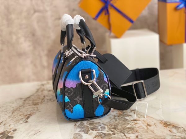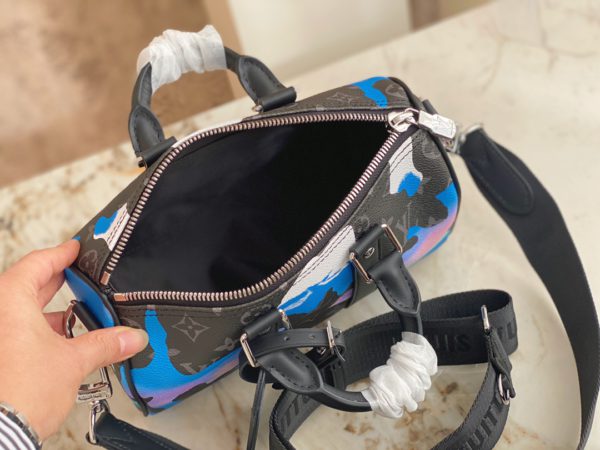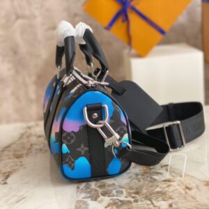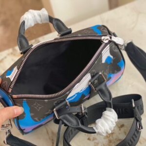 Printed Men’s Pillow Bag Series This Keepall 25 handbag is made of Monogram Eclipse Reverse canvas, showing the elegant reinterpretation of Louis Vuitton’s classic patterns. Reinforced straps and a leather nameplate continue the Keepall collection’s signature elements, while a zip closure keeps personal belongings secure. Dimensions: 25.0 x 15.0 x 11.0 cm (LxHxW)