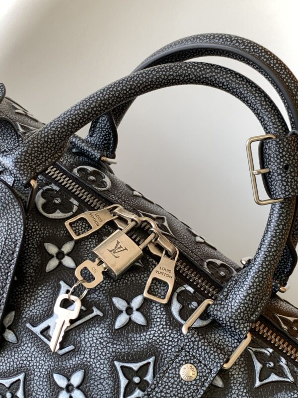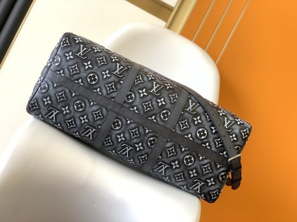Keepall Bandoulière 50 travel bag is one of Louis Vuitton’s classic holiday designs. This time it uses embossing and printing techniques to paint a faded Monogram pattern on the leather surface. Denim textured-leather outlines the side bands, top handle, and nameplate for a restrained look.