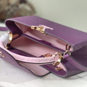 Medium-sized Capucines ostrich leather handbag with purple pink ostrich pattern, moderate hardness handle, gorgeous buckle connecting the handle, spacious and practical shape, etc. The drop cover can be used in two ways, and it can be placed outside the bag to show the fashion trend of the Monogram flower pattern.