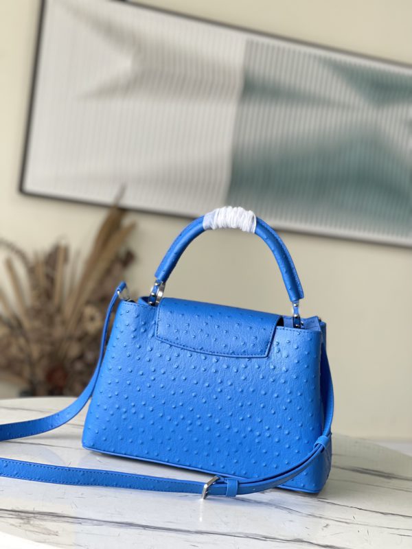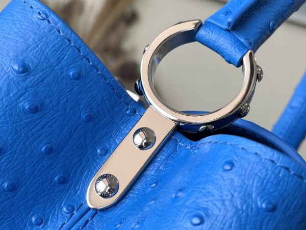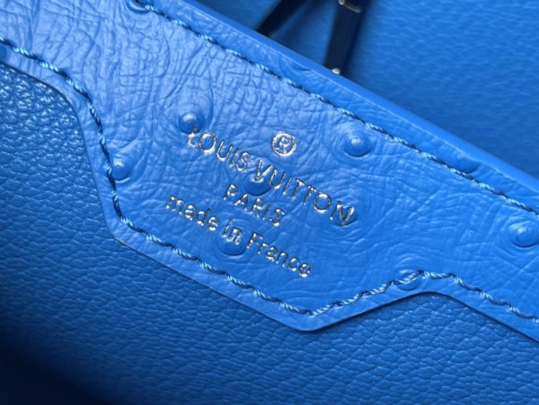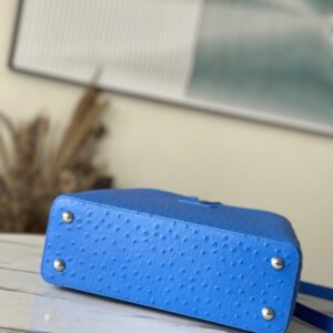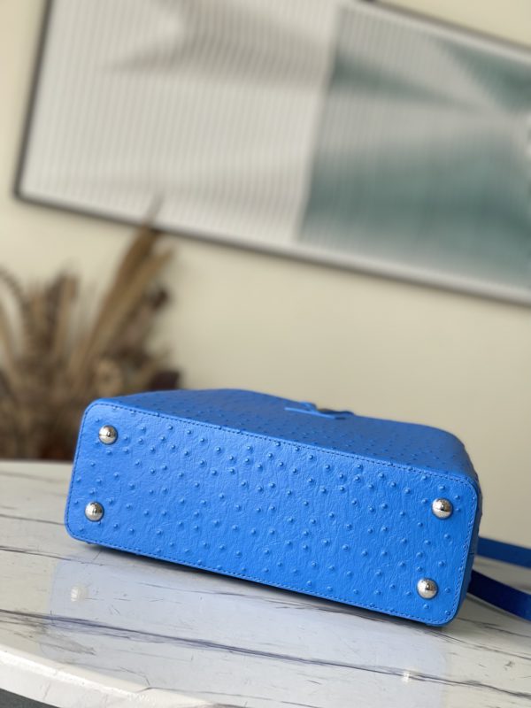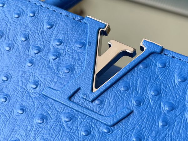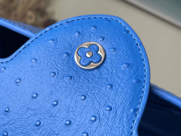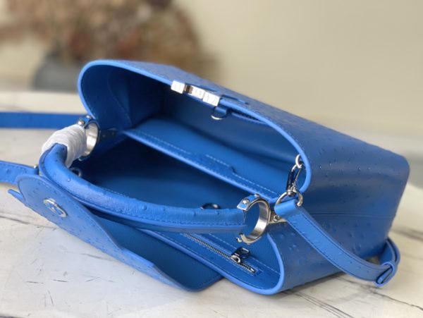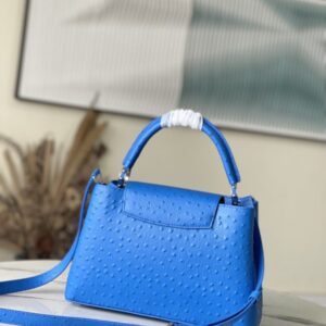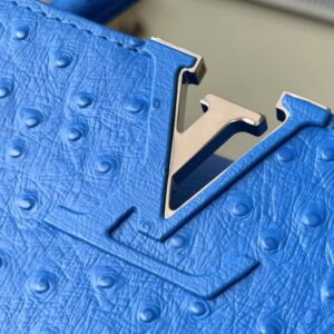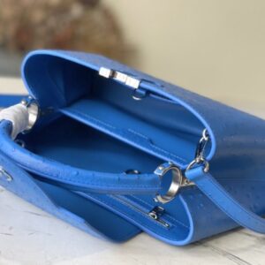 Medium-sized Capucines ostrich leather handbag with blue ostrich pattern, moderate hardness handle, gorgeous buckle connecting the handle, spacious and practical shape, etc. The drop cover can be used in two ways, and it can be placed outside the bag to show the fashion trend of the Monogram flower pattern.