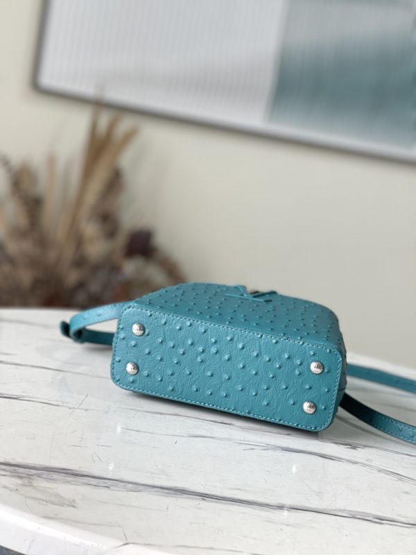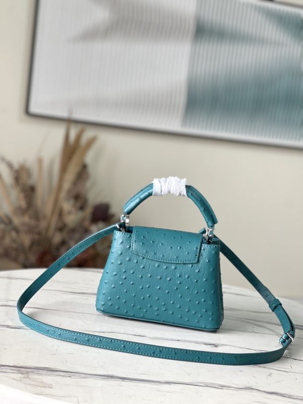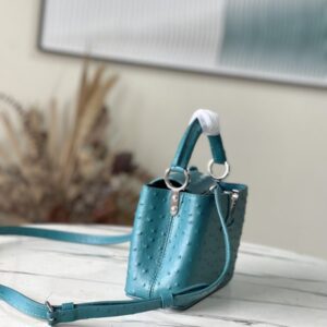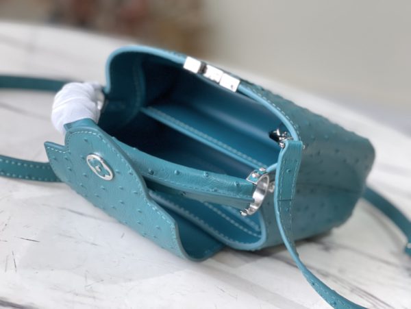 Blue ostrich leather mini Capucines ostrich leather handbag, moderate hardness handle, gorgeous buckle connecting the handle, spacious and practical shape, etc. The drop cover can be used in two ways, and it can be placed outside the bag to show the fashion trend of the Monogram flower pattern.