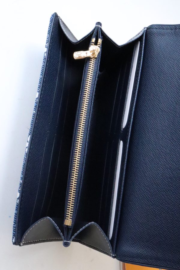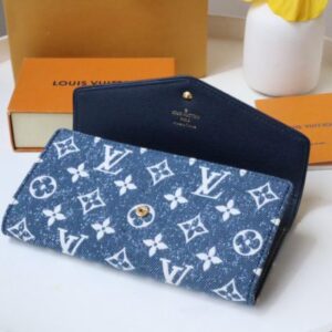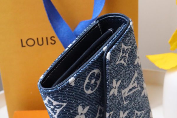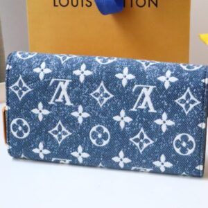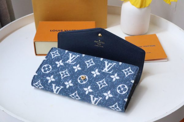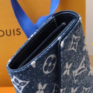 Reinterpreted in Monogram jacquard denim with matching cowhide trim, the classic Monogram pattern is reinterpreted using jacquard weaving technology and created in a stonewashed denim shape. This elegant envelope wallet features a Louis Vuitton engraved snap closure that opens to reveal multiple pockets and a credit card slot.