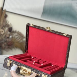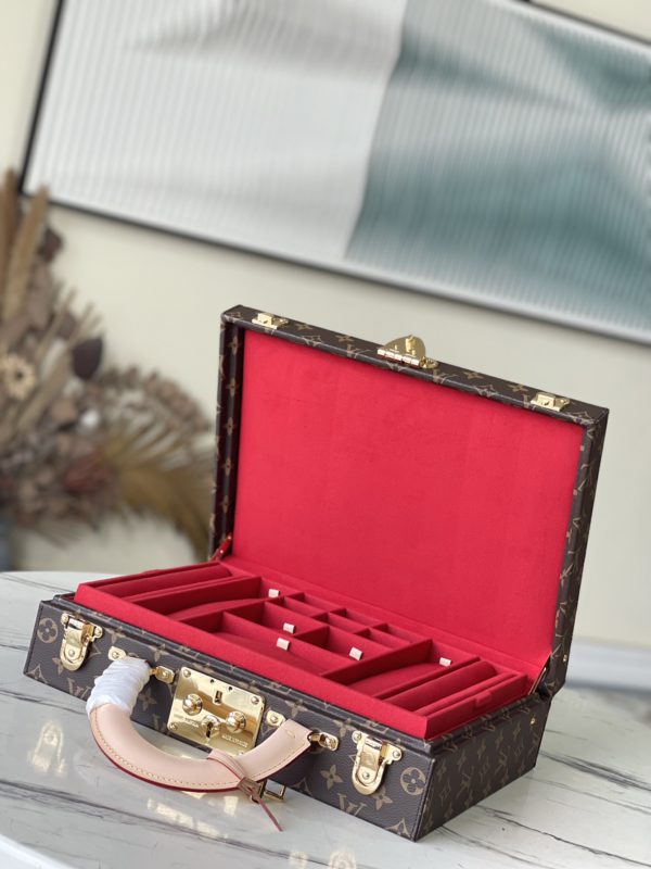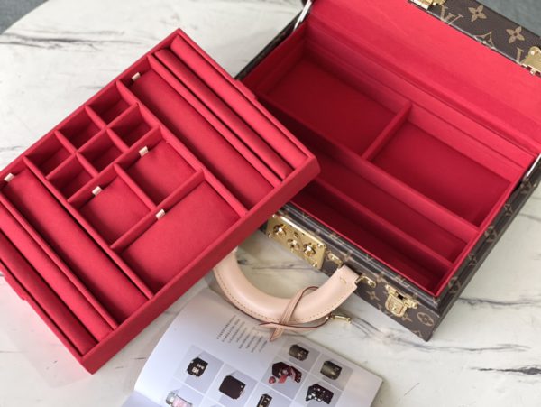 Red This Monogram jewelry case is especially suitable for carrying precious items when traveling. There are thirteen compartments of different sizes, which are opened and closed by S lock and two suitcase mortise locks. This product is expected to arrive in more than three months.