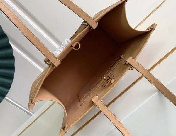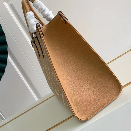 This Onthego medium handbag is made of Monogram Empreinte leather, which is printed, embossed and embroidered to present delicate stitching. The quilted interior resembles a traditional hard case. The focus design of the season has various carrying methods and sizes: 35 x 27 x 14 cm