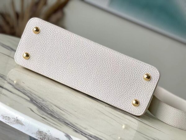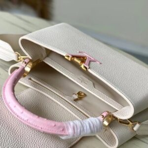 Ostrich pattern small Capucines handbag is made of Taurillon leather to create an exquisite shape, and the flap, handle and LV letters are wrapped in ostrich leather. The flip cover can be opened or closed to read the LV logo, and the detachable wide leather shoulder strap is full of modern style.