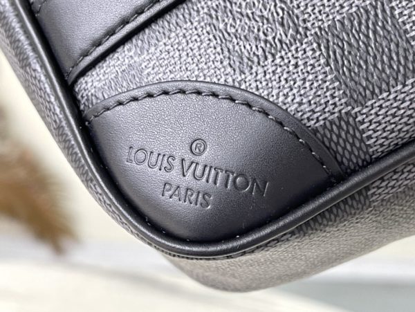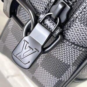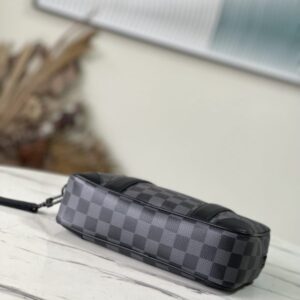 Black Grid Men’s Bag Clutch Clutch Collection POCHETTE KASAI Clutch This Kasaï pouch is made of Damier graphite canvas, with reinforced corners and black leather straps on the front, and a zip back pocket. Its wide zip opening provides access to three flat pockets and ten card slots. The piece can be worn as a bag or on the wrist with its detachable strap.
