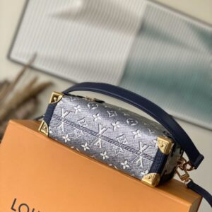 This Side Trunk handbag is an eye-catching new work inspired by Nicolas Ghesquiere’s classic suitcases. The Monoglam canvas body is made from a laminated jacquard base fabric woven with cotton and decorative threads for an almost holographic visual effect. Metal wrapped corners, an S-lock closure, and colorful trim enrich the details.