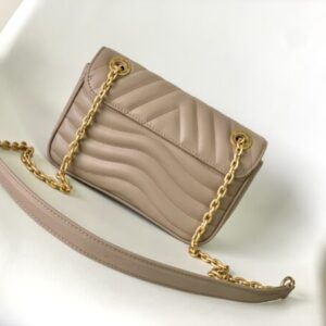 This New Wave small chain bag combines the Wave chain bag and the Multi Pochette Accessoires handbag. Padded quilted calfskin creates a wave shape, and the sliding chain shoulder strap allows long or short shoulder and cross-body options. Dimensions: 21 x 12 x 9 cm