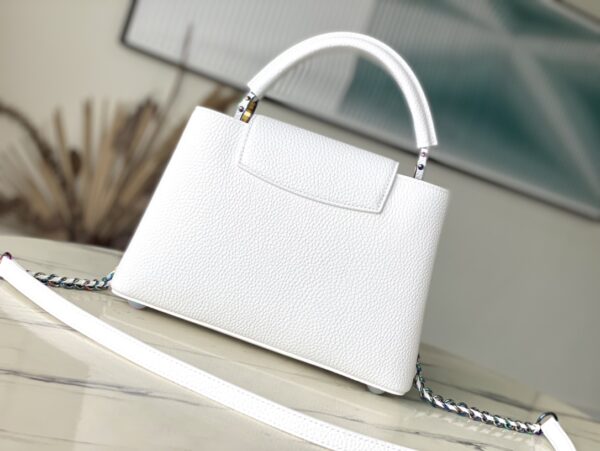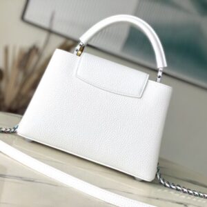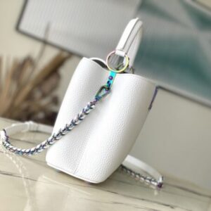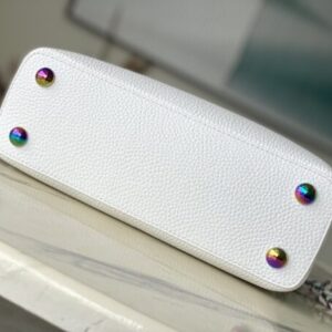 Capucines BB handbag gives colorful colors to the LV letters and woven chain, which contrasts with the simple and elegant style of the Taurillon leather bag. The jewelry-like handle rings and rivets continue the lustrous color, while the metal hardware adds bright details.