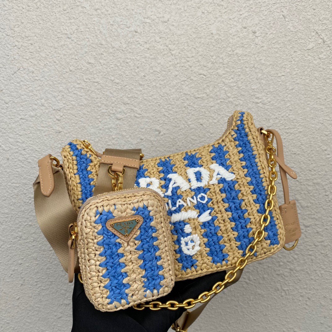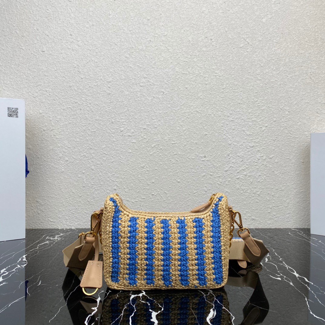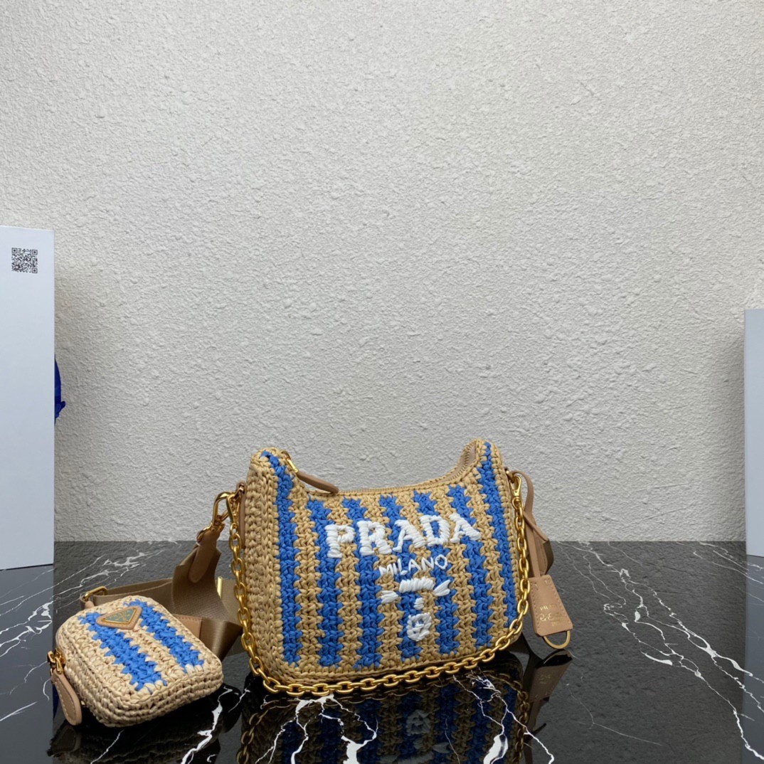 Prada Re-Edition 2005 Bag In Beige and Blue Stripe Raffia