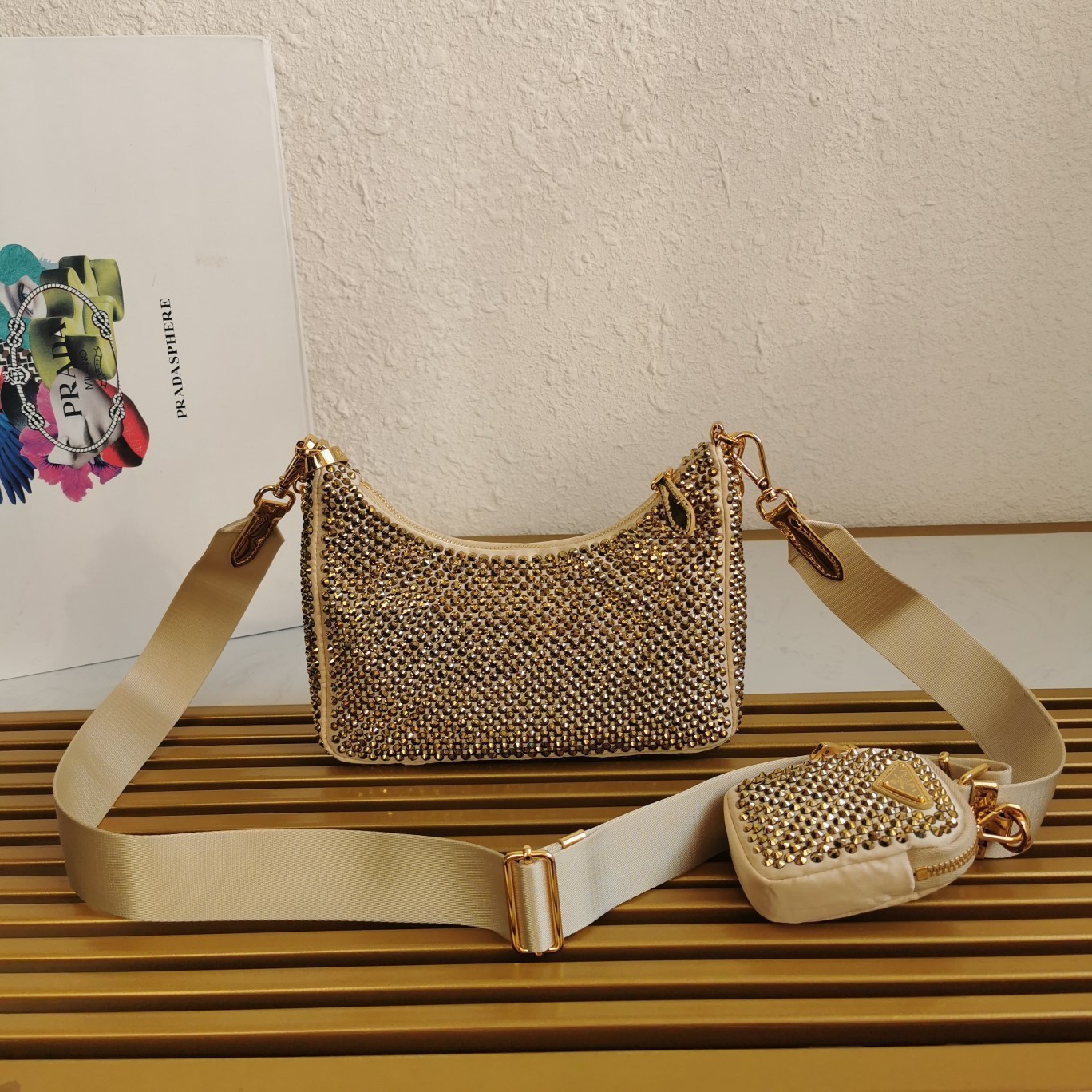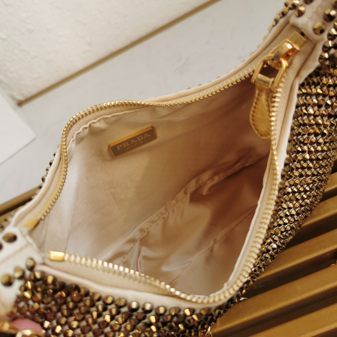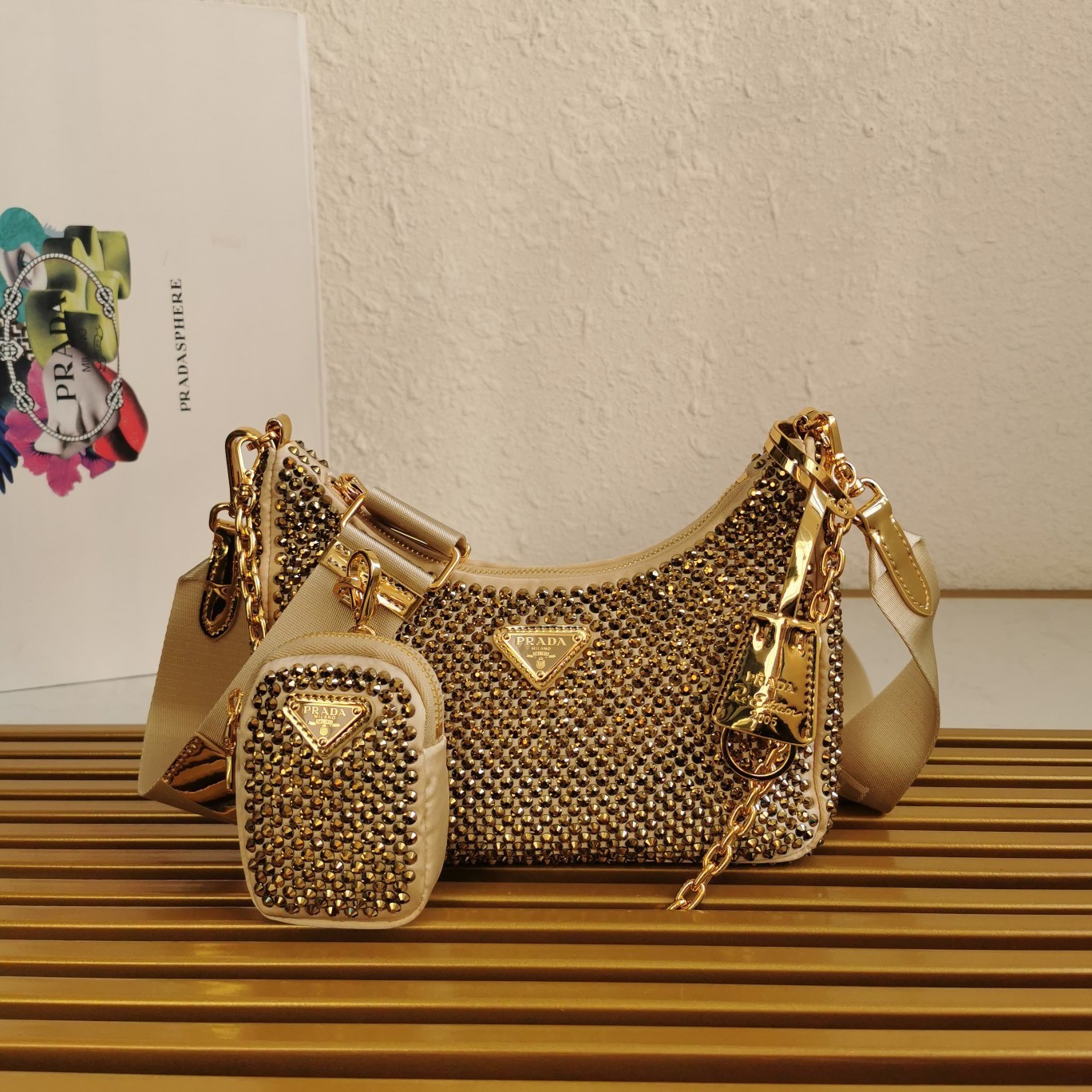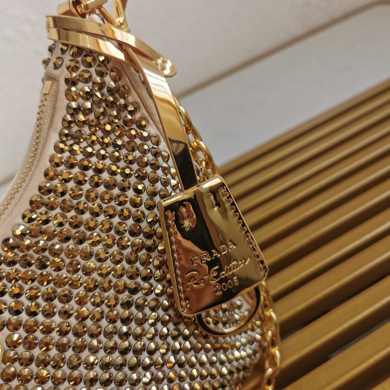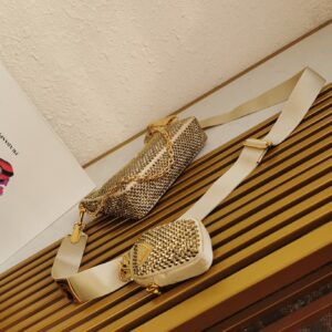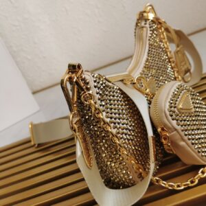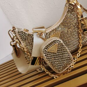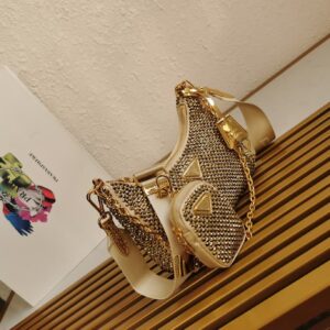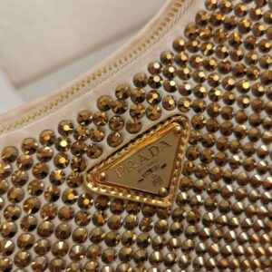 Prada Re-Edition 2005 Bag In Gold Satin with Crystal