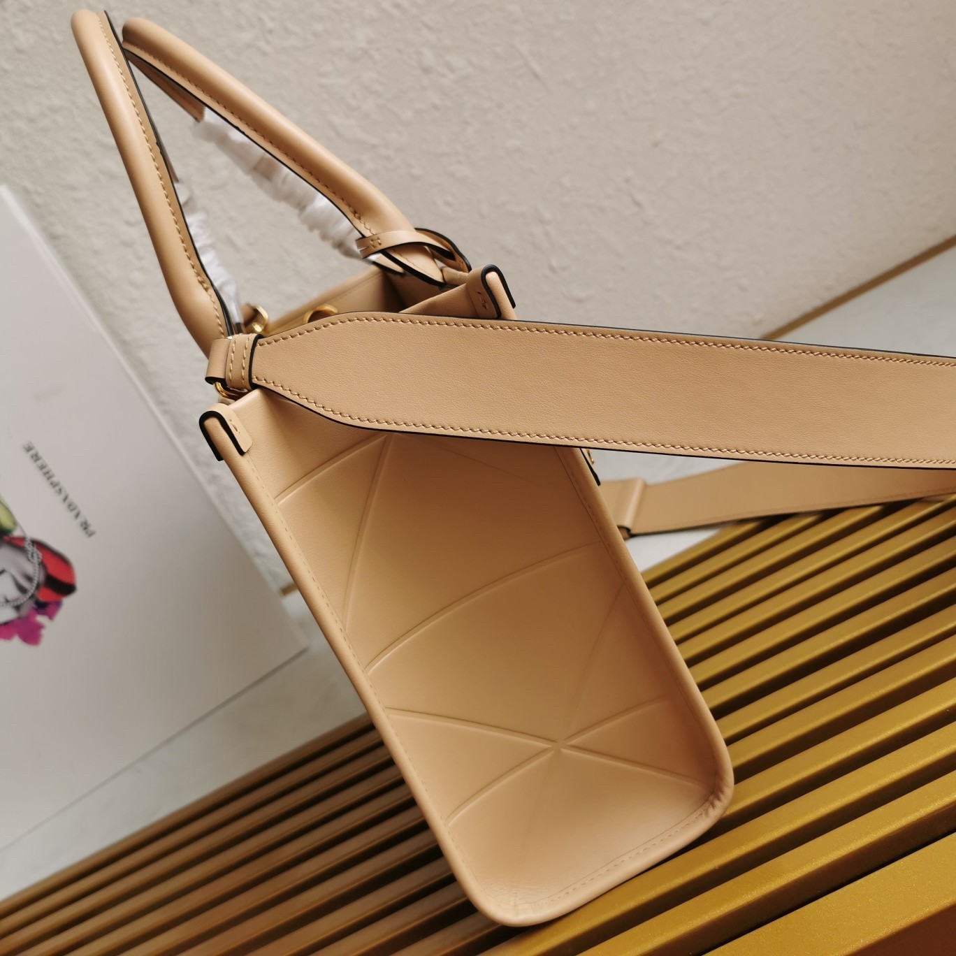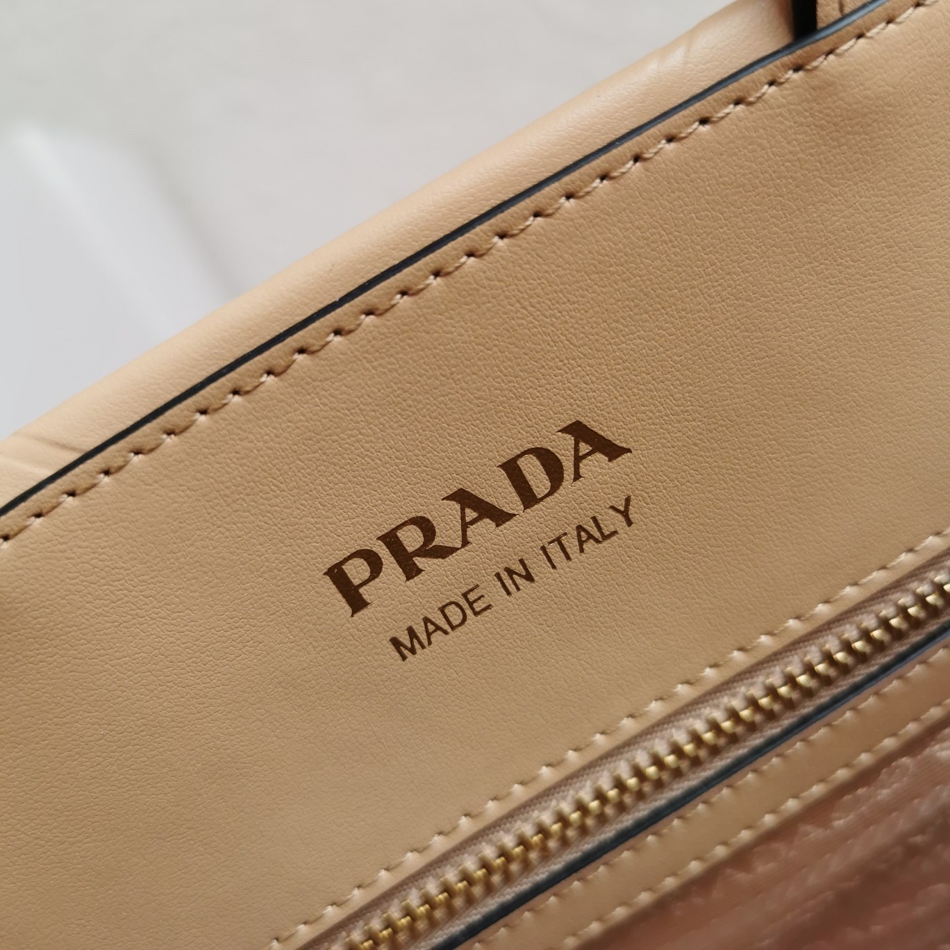 – Prada nylon logo lining with two pockets, one with zipper