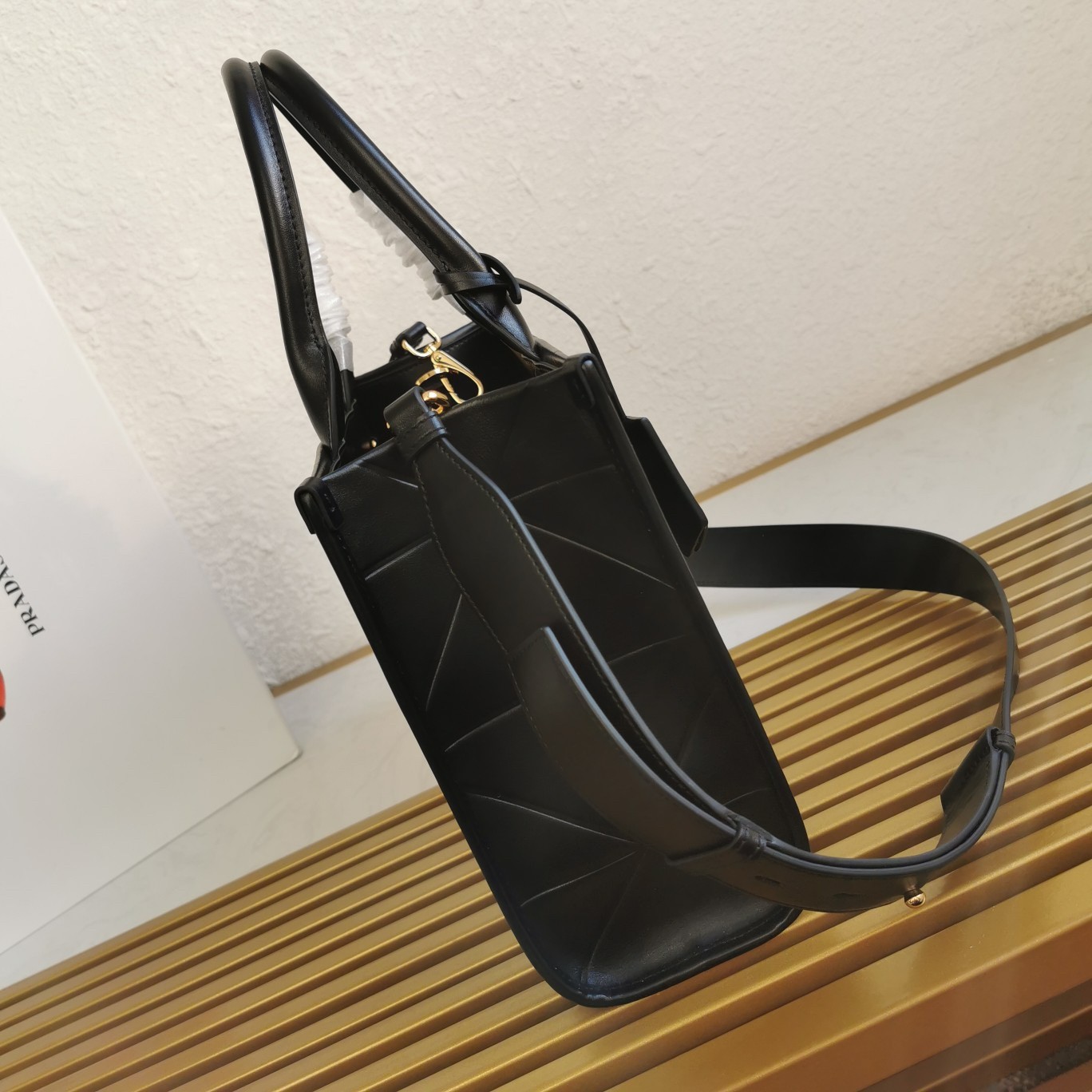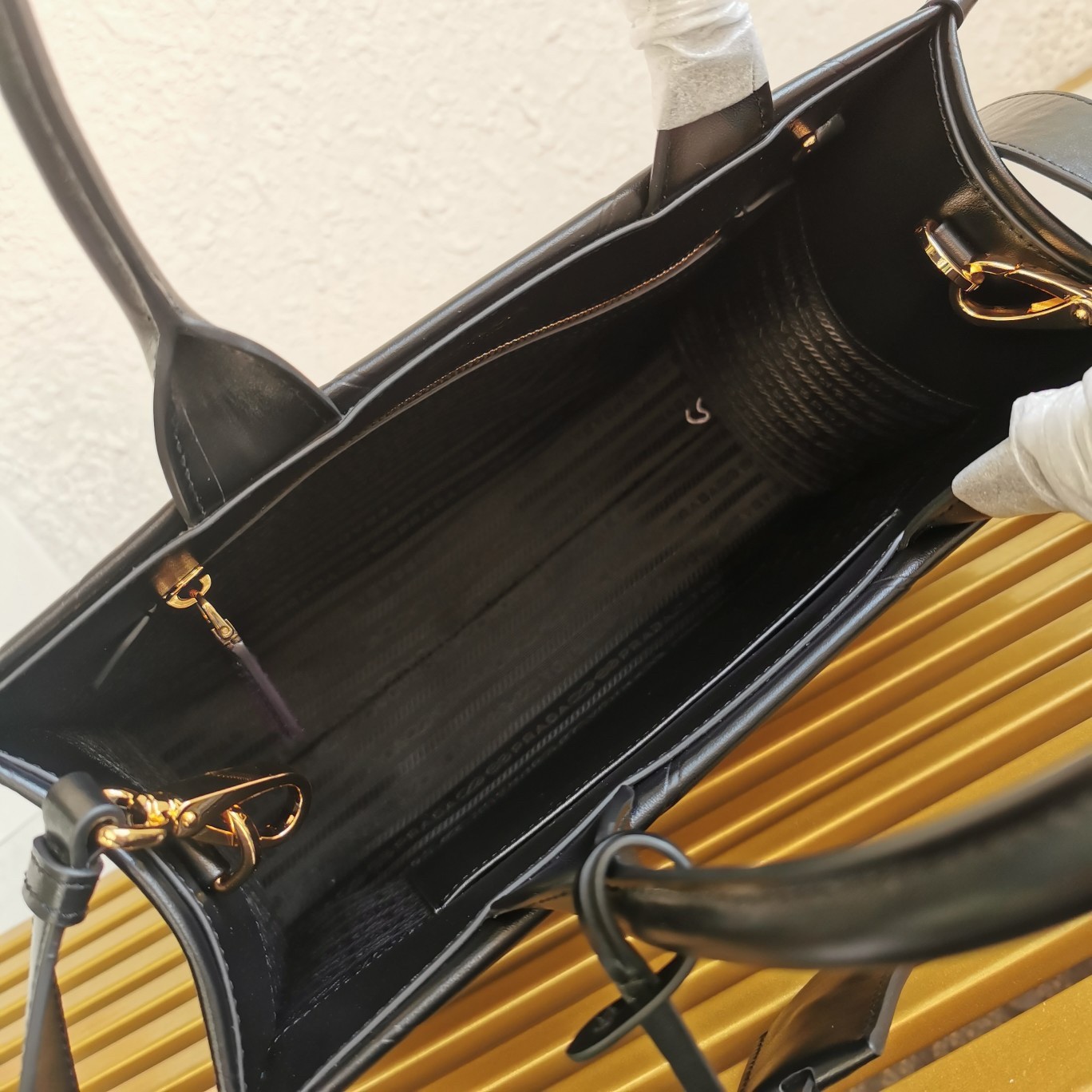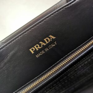 – Prada nylon logo lining with two pockets, one with zipper