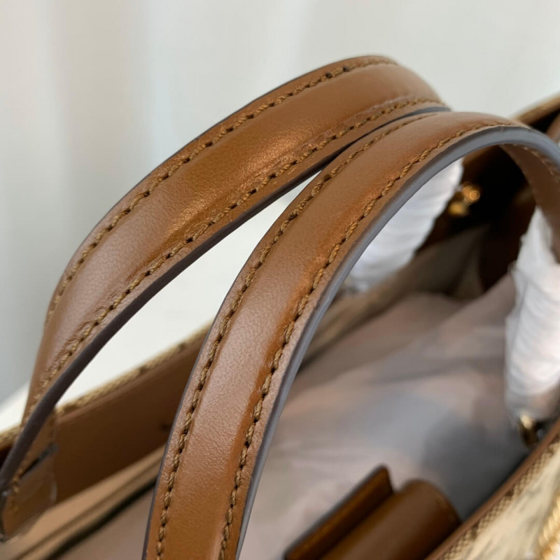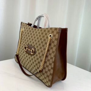 Designed with rounded edges and a soft shape. the tote bag is introduced to the Gucci 1955 Horsebit collection for Spring Summer2020. Made from GG Supreme canvas with brown leather trim. the large double-handled silhouette has a chain shoulder strap that complements its modern spirit. finished with an organizational interior and magnetic snap closure. The collection unifies details first introduced on the original bag that inspired the line from over six decades ago with a modern spirit. highlighting the Horsebit. Part of Gucci’s genetic code. the double ring and bar design has been established as one of the most distinctive elements among the House symbols borrowed from the equestrian world.