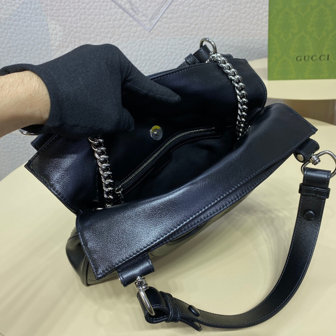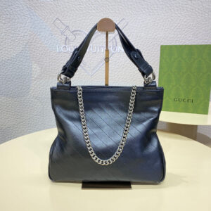 The Round Interlocking G that characterizes the Gucci Blondie line originates from the House archives. Signature pieces such as this Gucci Blondie tote bag with a top handle and chain shoulder strap reinterprets the emblem as a subtler leather patch detail.