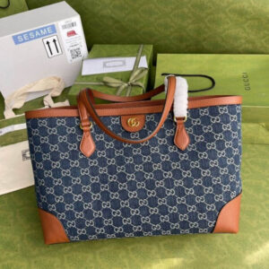 A cult fabric is imagined through the Gucci lens with the emblematic monogram motif. A part of the Ouverture collection. the Ophidia is presented in organic GG jacquard denim. The vintage inspired style is completed by the Double G??an archival symbol from the ’70s.