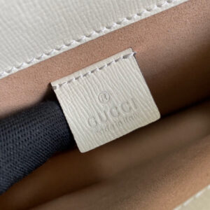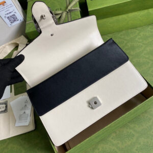 The Gucci Dionysus Small Shoulder Bag 400249 Orange White Leather is a stunning piece inspired by Greek mythology. It features a tiger-shaped closure that is the signature of the Dionysus line. The bag is made of burnt orange and white grainy leather with black grainy leather trim. The hardware is palladium-toned with blue enamel. adding a pop of color to the bag. The pin closure has a side release. and the tiger head closure is a beautiful detail that adds to the bag’s overall aesthetic. The edges are hand-painted. giving the bag a polished finish.