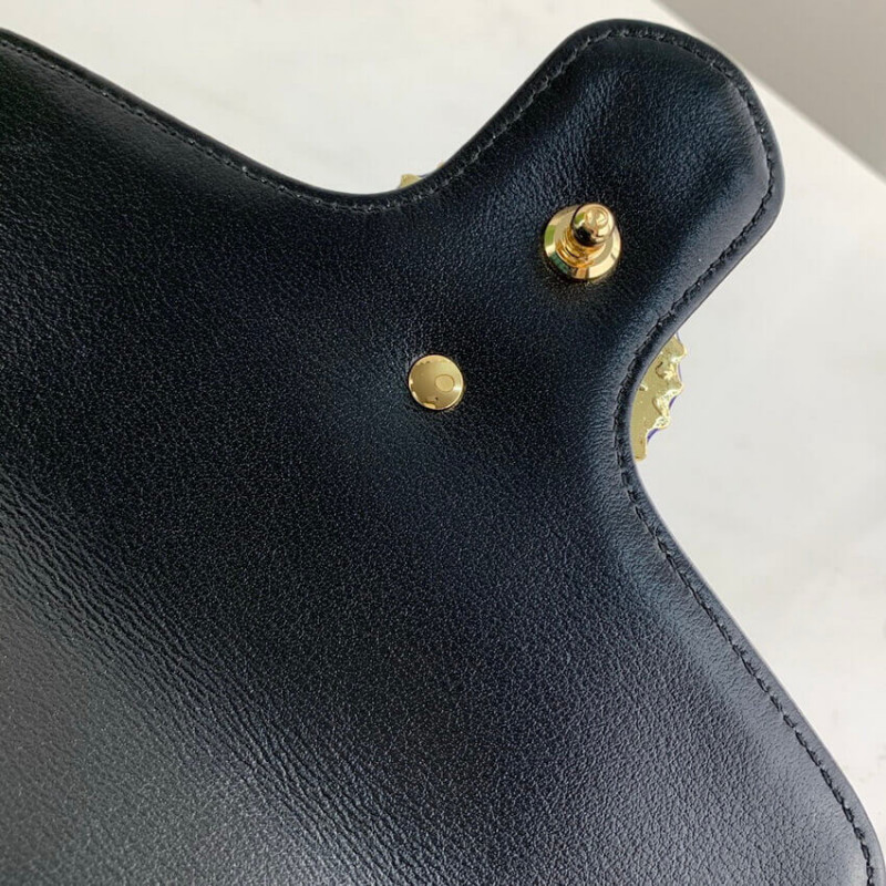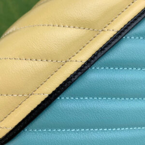 Soft shades appear throughout the latest collections. adding a whimsical feel. The GG Marmont bag is presented in diagonal matelasse quilted leather in soft shades of butter and blue. The mini top handle’s distinct softly structured shape is outlined in black piping. highlighting its flap closure.