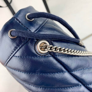The GG Marmont mini bucket bag is reimagined in blue diagonal matelasse quilted leather. enhanced by the House’s monogram hardware on the front. A characteristic symbol of the line. the Double G evolves from a belt buckle from the ’70s archives. The petite accessory is completed by a chain strap. allowing it to be worn in multiple ways.