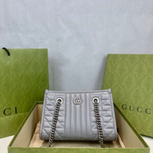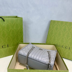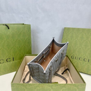 The Gucci GG Marmont Small Tote Bag 681483 is a part of the GG Marmont collection. which is known for its Double G hardware. This hardware is a modern interpretation of a Gucci belt buckle from the 1970s and has become a signature of the brand. The small tote bag is made of soft white matelasse leather and features antique silver-toned hardware. The interior is lined with microfibre and has a suede-like finish. The bag has one open pocket and a strap drop of 28cm. The dimensions of the bag are W26.5cm x H19cm x D11cm.