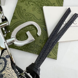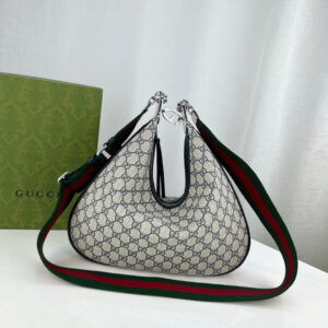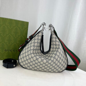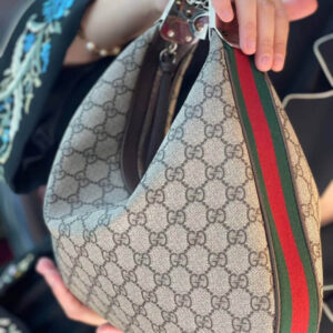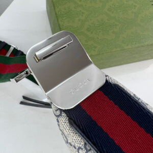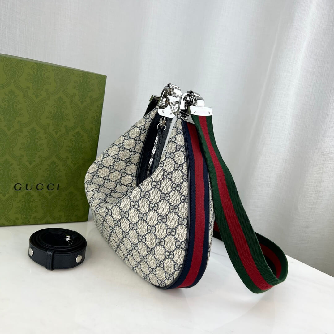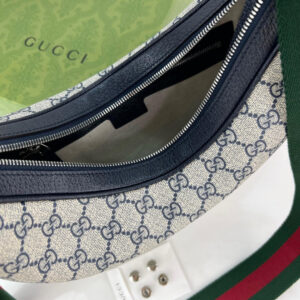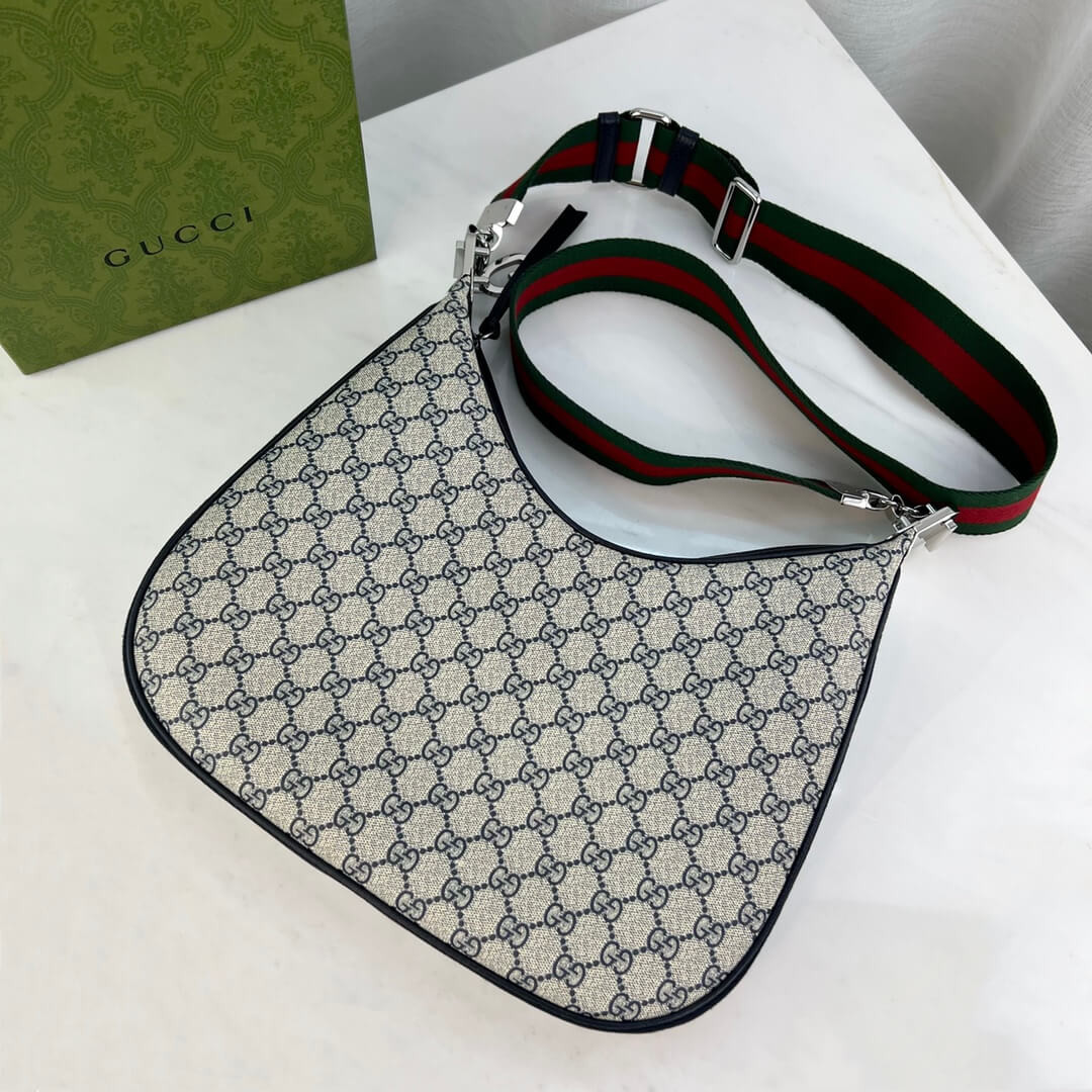 An ode to the timeless Hollywood glamour that shaped Gucci Love Parade, classic elements from the House’s archives are reintroduced. Distinguished by its crescent moon shape, the accessory is further defined by a G shaped hook closure. Paired with soft materials, the heritage hardware creates a refined design with vintage appeal. This medium version is crafted from beige and blue GG Supreme canvas, complete with a blue and red Web trim.