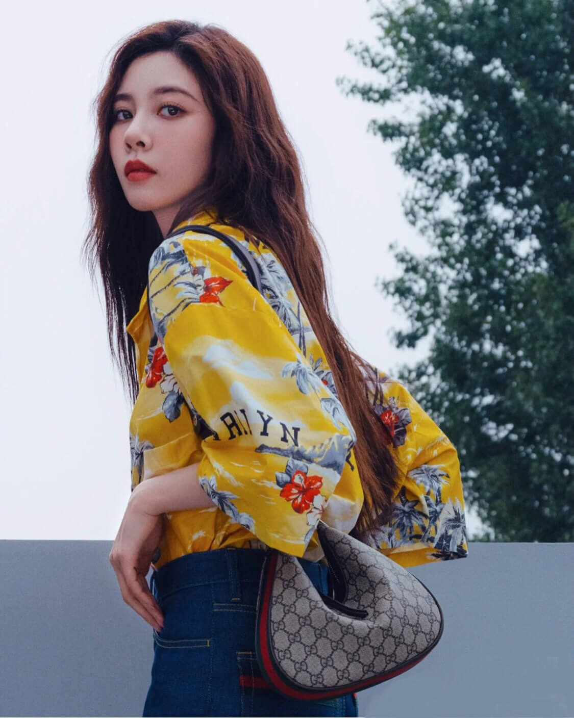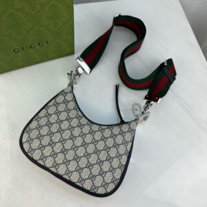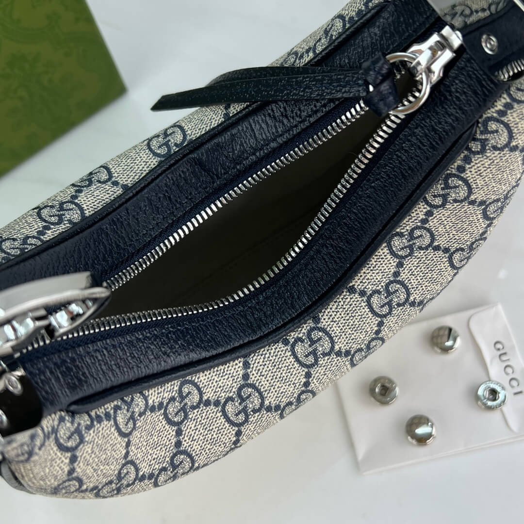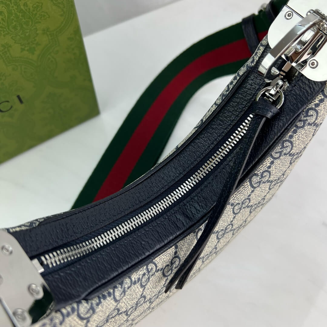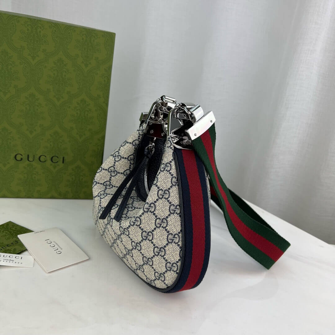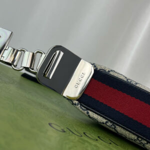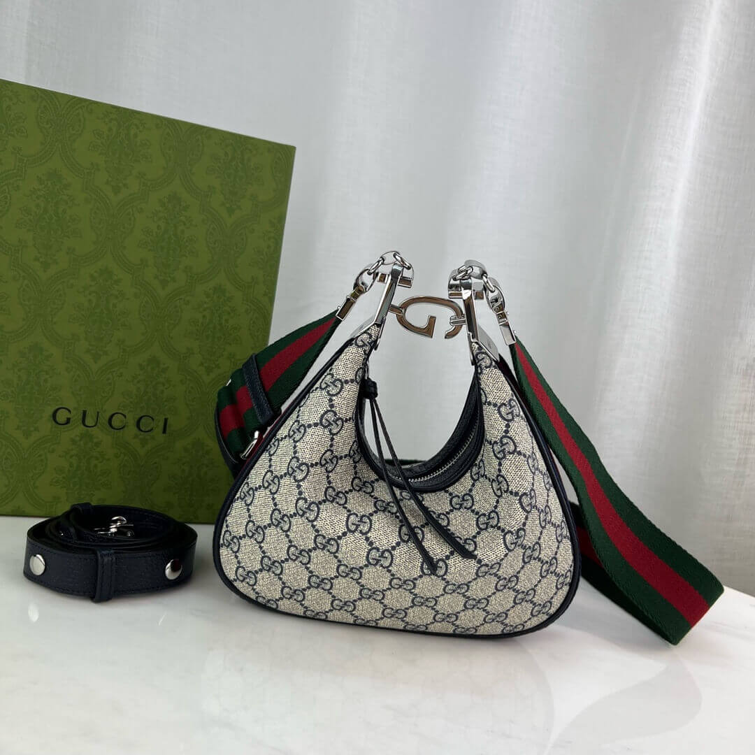 An ode to the timeless Hollywood glamour that shaped Gucci Love Parade, classic elements from the House’s archives are reintroduced. Distinguished by its crescent moon shape, the accessory is further defined by a G shaped hook closure. Paired with soft materials, the heritage hardware creates a refined design with vintage appeal. This small version is crafted in beige and ebony GG Supreme canvas with brown leather trim.