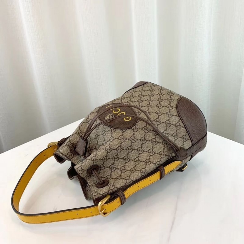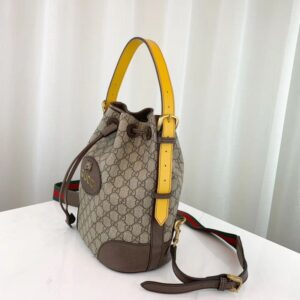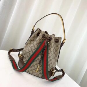 A drawstring backpack with a bucket shape made in soft GG Supreme. crafted from a coated microfiber fabric. The back shoulder straps come with a mechanism that allows them to be released and adjusted to be worn as a shoulder strap. The contrast handle pays homage to the House’s past. when artisans would repair luggage by replacing worn handles with new ones in any colors that were available.