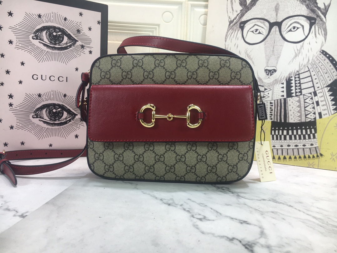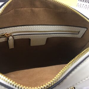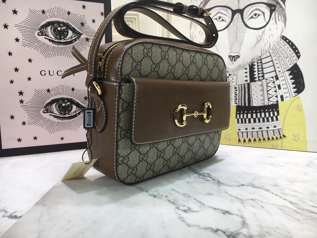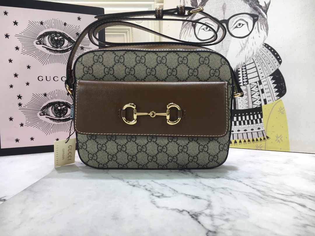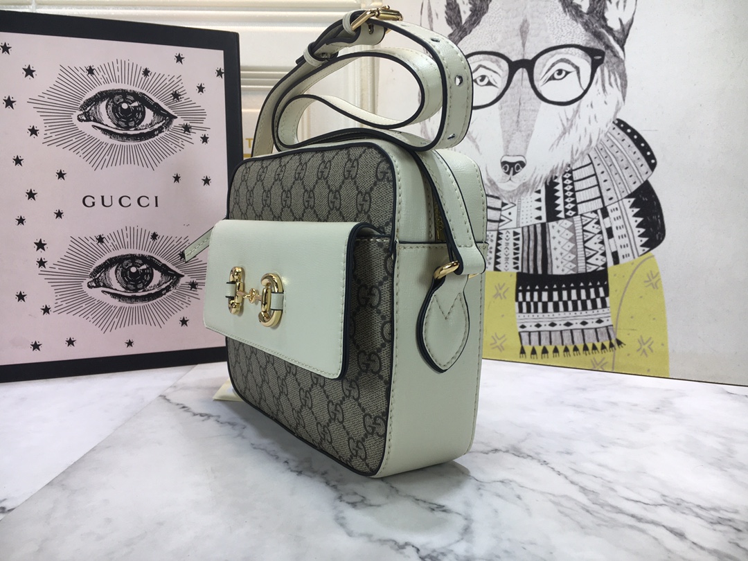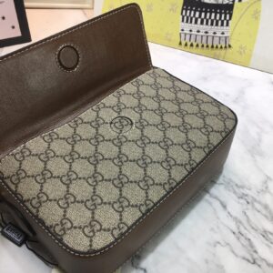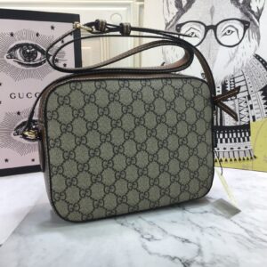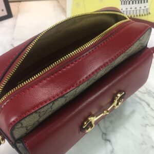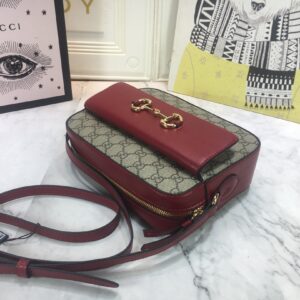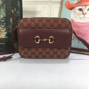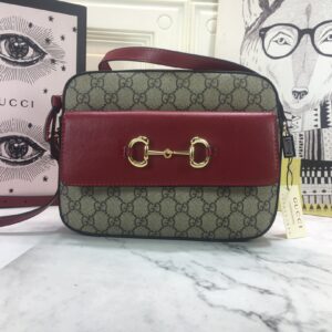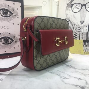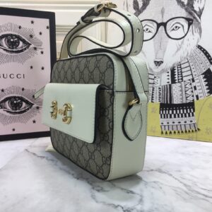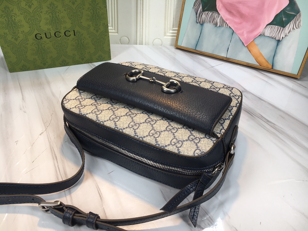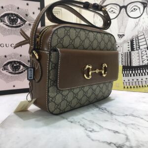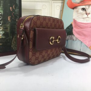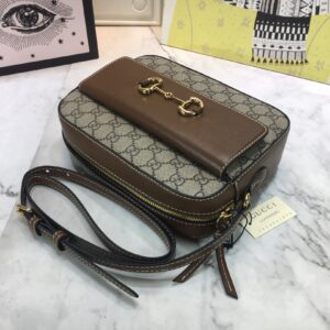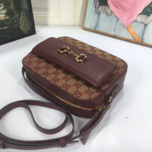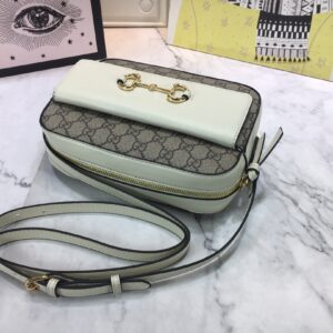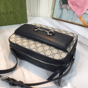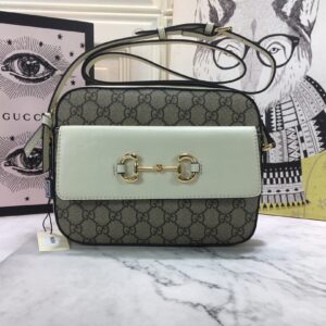 The Gucci Horsebit 1955 small bag comes in five colors and is a timeless piece that is perfect for any occasion. Measuring 22.5 x 17 x 6.5 cm. this bag is made of beige and blue GG Supreme canvas. a material that has a low environmental impact. The bag also features blue leather trim and gold-toned hardware. giving it a luxurious look. The microfiber lining has a suede-like finish. adding to the bag’s elegance. The front of the bag has a horsebit detail. which is a signature of the House. The interior of the bag has a zip pocket. and there is also a front pocket for additional storage. The bag can fit a cell phone up to 3.1W x 6.6H x .4D. The shoulder strap has a 19.7?? drop. making it easy to carry. The bag weighs approximately .46kg. The GG Supreme canvas has a historic origin and has been used in collections for decades. The blue and beige mix of the canvas defines the classic palette of this small-sized Gucci Horsebit 1955 bag.