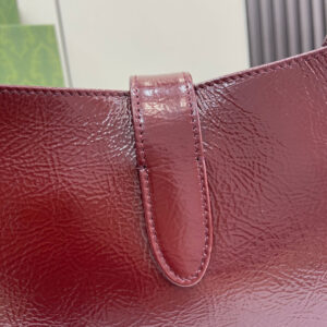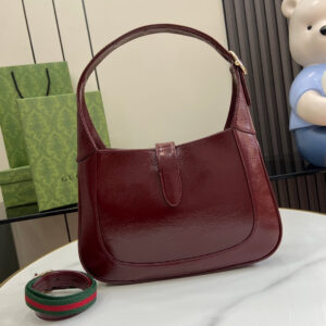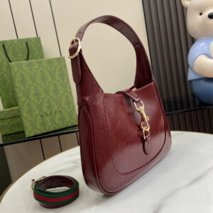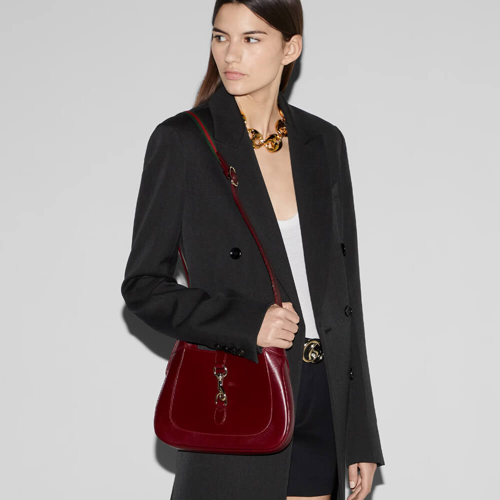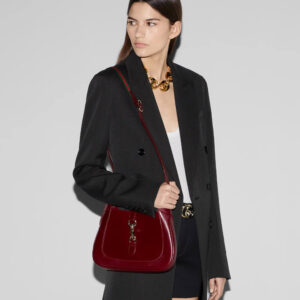 The new Gucci Jackie is crafted from fine leather which highlights the craftsmanship, crescent shape, and sleek silhouette of the House’s iconic shoulder bag. Light gold-toned hardware, leather trim, and an additional strap featuring the green and red Web gives this Gucci Jackie small shoulder bag in orange patent leather further styling options.