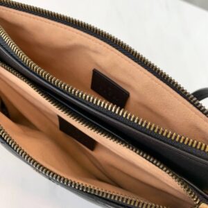 This bag features an adjustable leather shoulder strap and a removable snap-off pouch with an aged gold interlocking GG on the front. The top zippers open to a light beige interior. This compact. yet spacious shoulder bag is perfect for anytime of the day; whether it be for casual or formal wear. from Gucci!