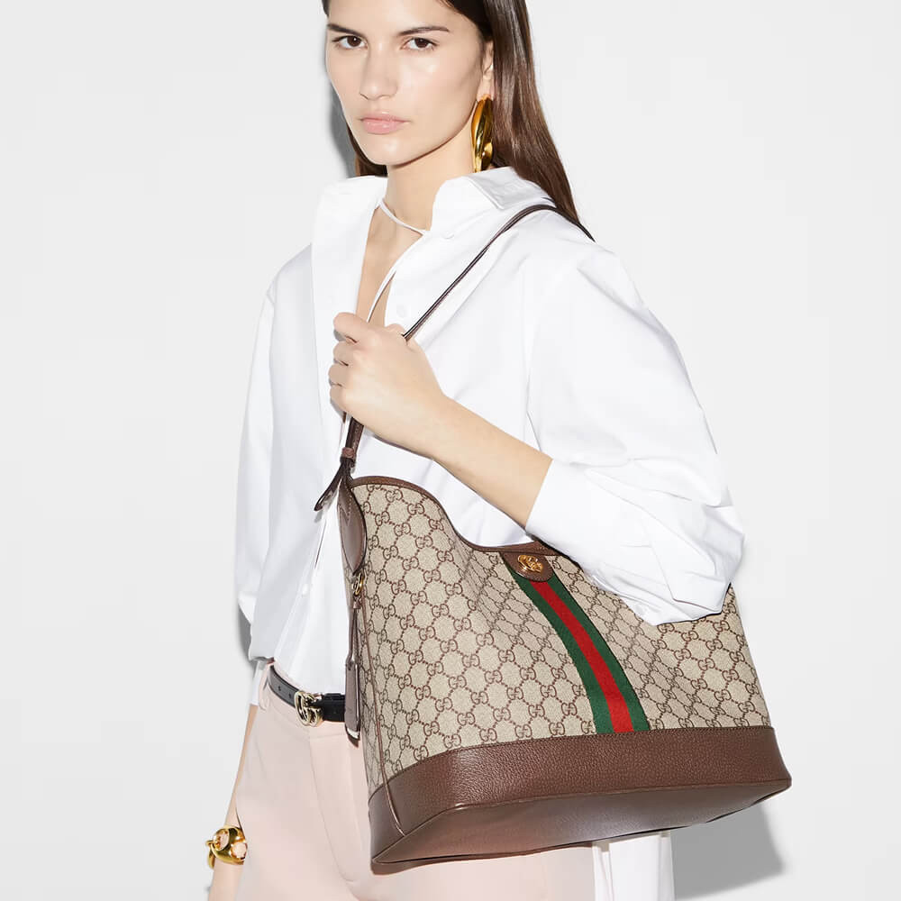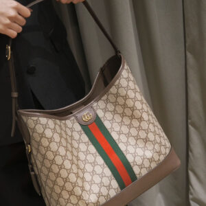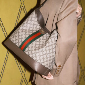 The Ophidia is reinvented in new and unexpected ways in this medium-sized piece which blends the open bucket design and shoulder bag style. It is crafted in the House’s signature GG Supreme canvas in the iconic color combination of beige and ebony.