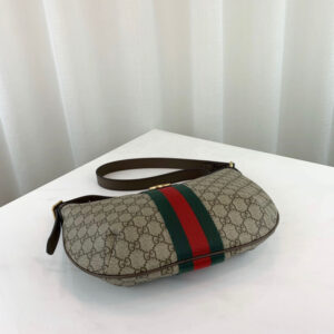 A classic combination of the House’s most recognizable elements??the GG motif and Web stripe??the world of Ophidia continues to evolve. incorporating new shapes and silhouettes. The half-moon design mixes emblematic references with the unique charms of the hobo bag. a popular Gucci model since the late ’50s. Crafted in GG Supreme canvas. it’s trimmed with textured leather and topped with Double G hardware.