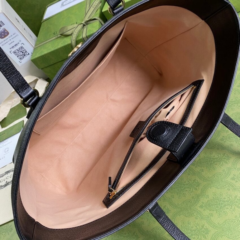 Enriched with vintage details. the world of Ophidia expands with the introduction of a black leather tote. With a softly structured silhouette. the bag pairs two archival details as a tribute to the origins of the House. The Double G is a reference to Guccio Gucci’s monogram while the green and red Web stripe is a celebration of the brand’s equestrian roots.