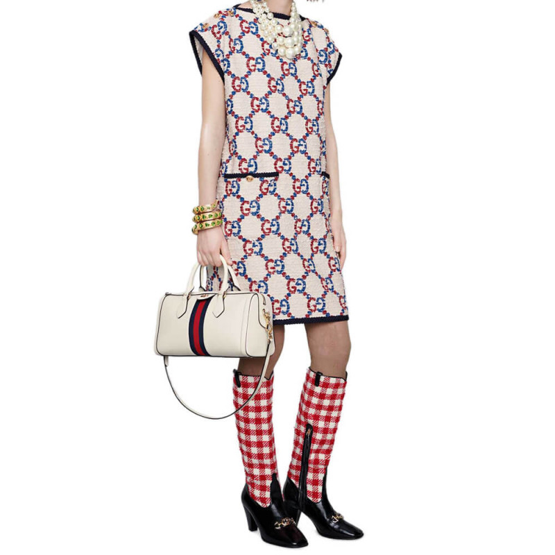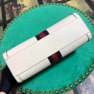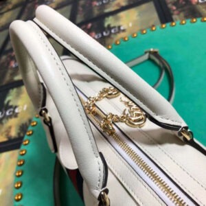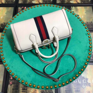 The world of Ophidia evolves with the introduction of a boston bag crafted in textured white leather with inlaid blue and red Web stripe. The accessory is enhanced by a petite play on the Double G. an archival Gucci code from the ’70s that appears atop a leather tab detail and on the zipper pull. The bag is completed with a detachable shoulder strap which allows it to be carried in multiple ways.