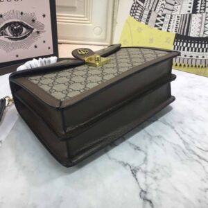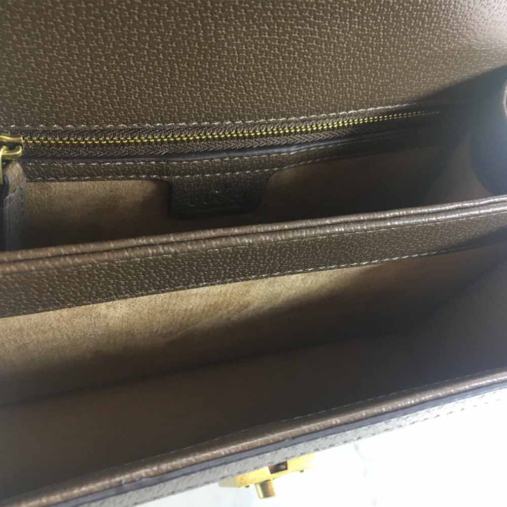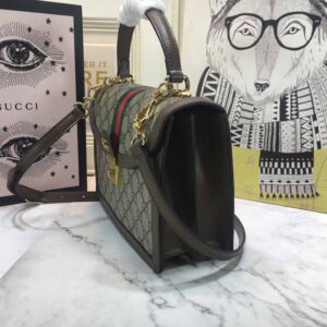 Introducing the Gucci Ophidia small top handle bag with Web 651055. a stylish and environmentally conscious accessory. Made from beige and ebony GG Supreme canvas. a material with low environmental impact. this bag features brown leather trim and shiny gold-toned hardware. The green and red House Web stripe adds a pop of color to the vintage-inspired square shape. which is accentuated by the Double G hardware. The microfiber lining with suede-like finish and internal zip and open pockets provide ample storage space. The inserts contain leather made through an alternative metal or chrome-free tanning process. reducing the environmental footprint compared to traditional methods. This small-sized bag can fit a cell phone up to 3.1W x 6.6H x .4D and comes with a handle with 4?? drop and a detachable shoulder strap with 19?? drop. The magnetic closure ensures your belongings stay secure. Weighing approximately .7kg. this bag is made in Italy and is part of the Epilogue collection. The model is 5’5?? tall. Upgrade your accessory game with the Gucci Ophidia small top handle bag with Web 651055.