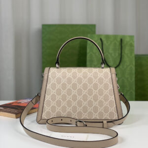 A structured GG Supreme canvas top handle bag appears beige and white with subtle oatmeal leather trim. The textured tiger head closure defines the front as a unique hardware detail.