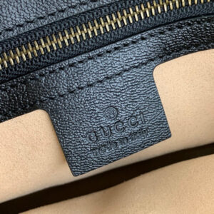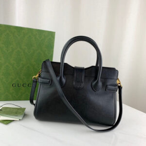 Taken from the ’70s archives. the Double G recalls one of the heydays of the House. The hardware first appeared as a monogram belt buckle but has evolved into one of the brand’s most emblematic codes. Here. the gold-toned detail defines a top handle bag in black leather. A detachable shoulder strap adds a versatile note to the style.