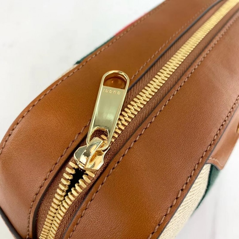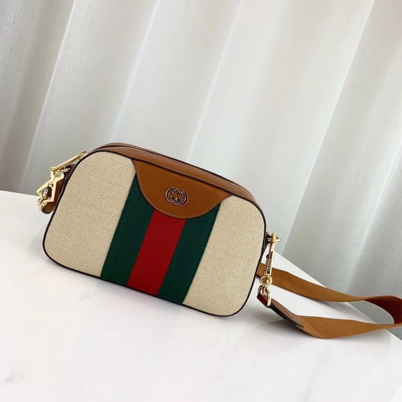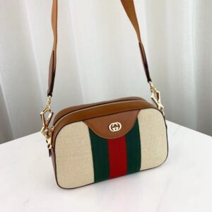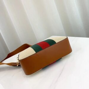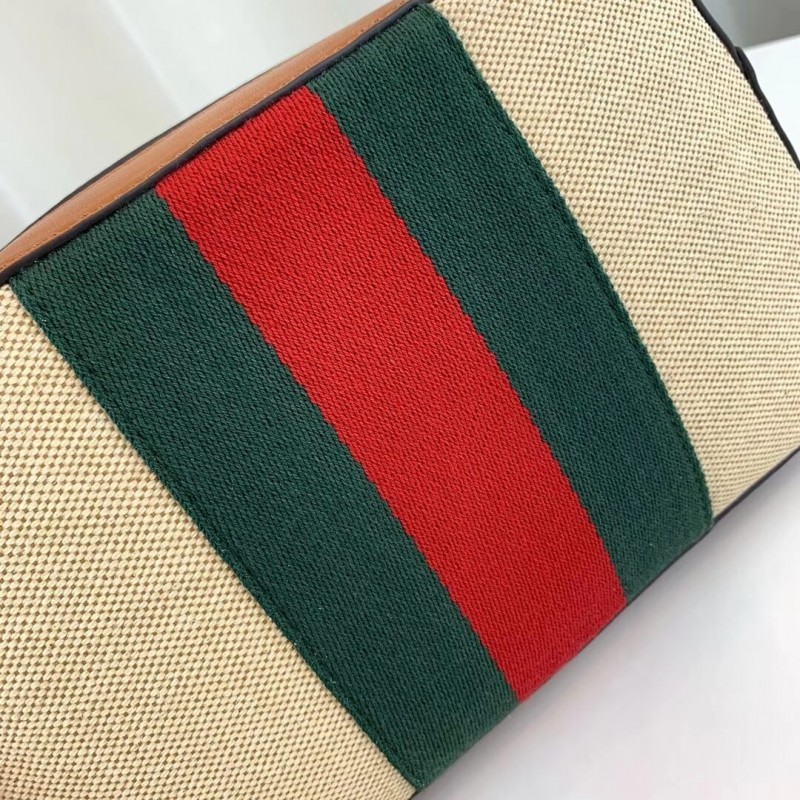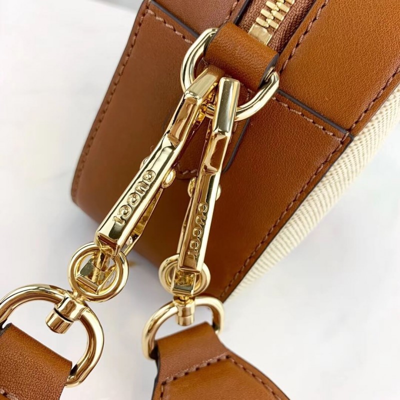 The shoulder bag. designed with a softly structured rectangular shape recalls traditional camera cases. presented in beige canvas. The bi-color woven fabric has a slightly aged effect that enhances a vintage appearance. trimmed with the House Web and brown leather. Completed with a wide nylon shoulder strap that can be removed using metal clips on each side. New shapes and signature Gucci lines are reimagined in a mix of fabrics and trims imbued with an inherently summer feel.