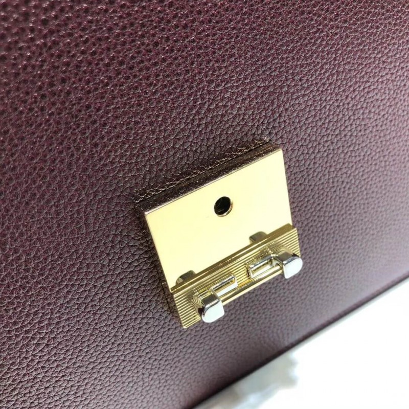 A new shape introduced to the Gucci Zumi line for Pre-Fall 2019. the small shoulder bag in burgundy grainy leather is enriched with the collection’s distinctive Interlocking G Horsebit. Gucci continues to bring House icons to the forefront in unexpected ways. merging two of its codes into one symbol in a modern mix of silver and gold tones. First presented in Spring Summer 2019. Gucci Zumi takes its name from actress and experimental musician Zumi Rosow. who walked the runway carrying the bag. The shoulder bag has a flap with a special bar closure that open when both sides are pushed in together.